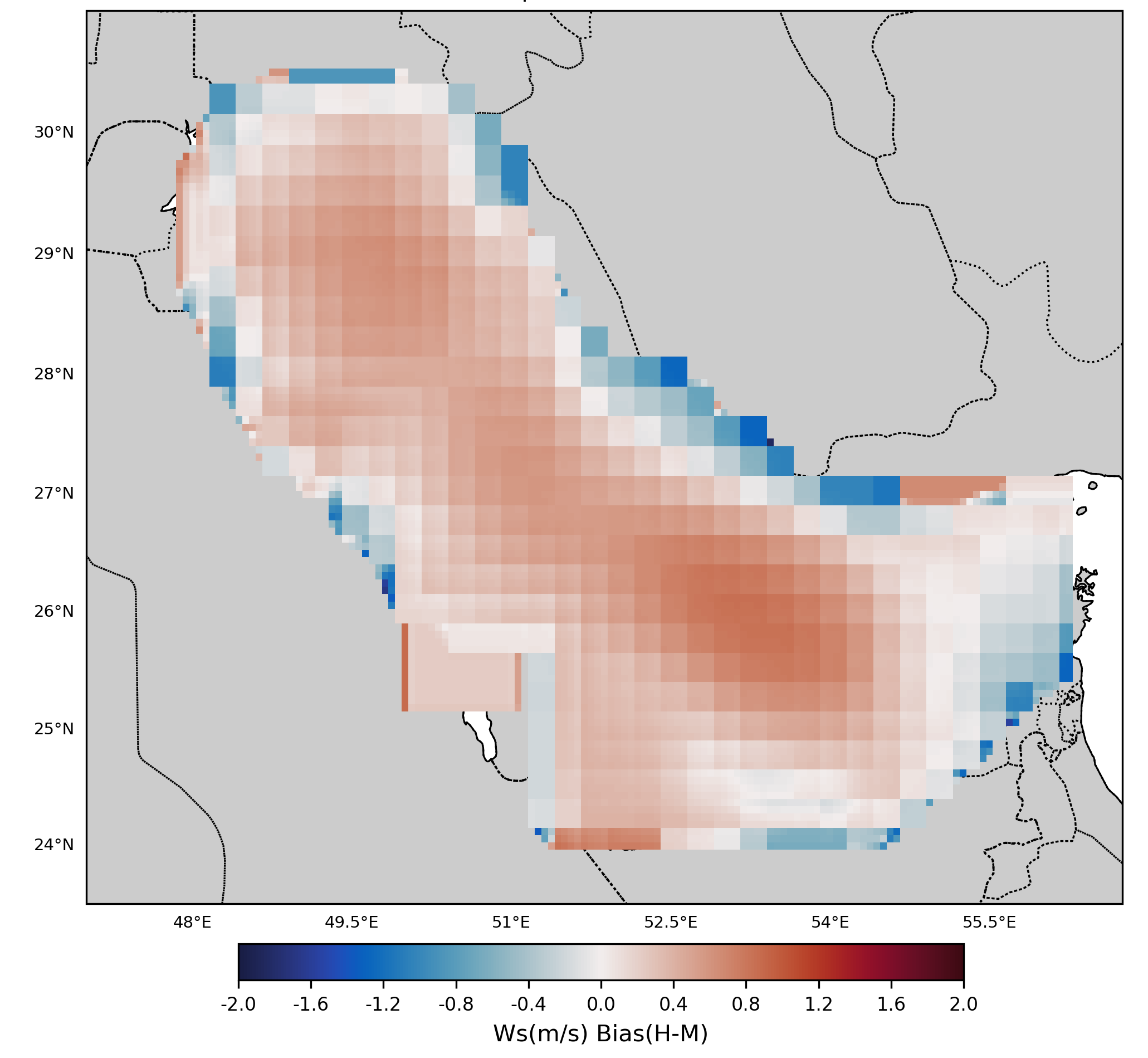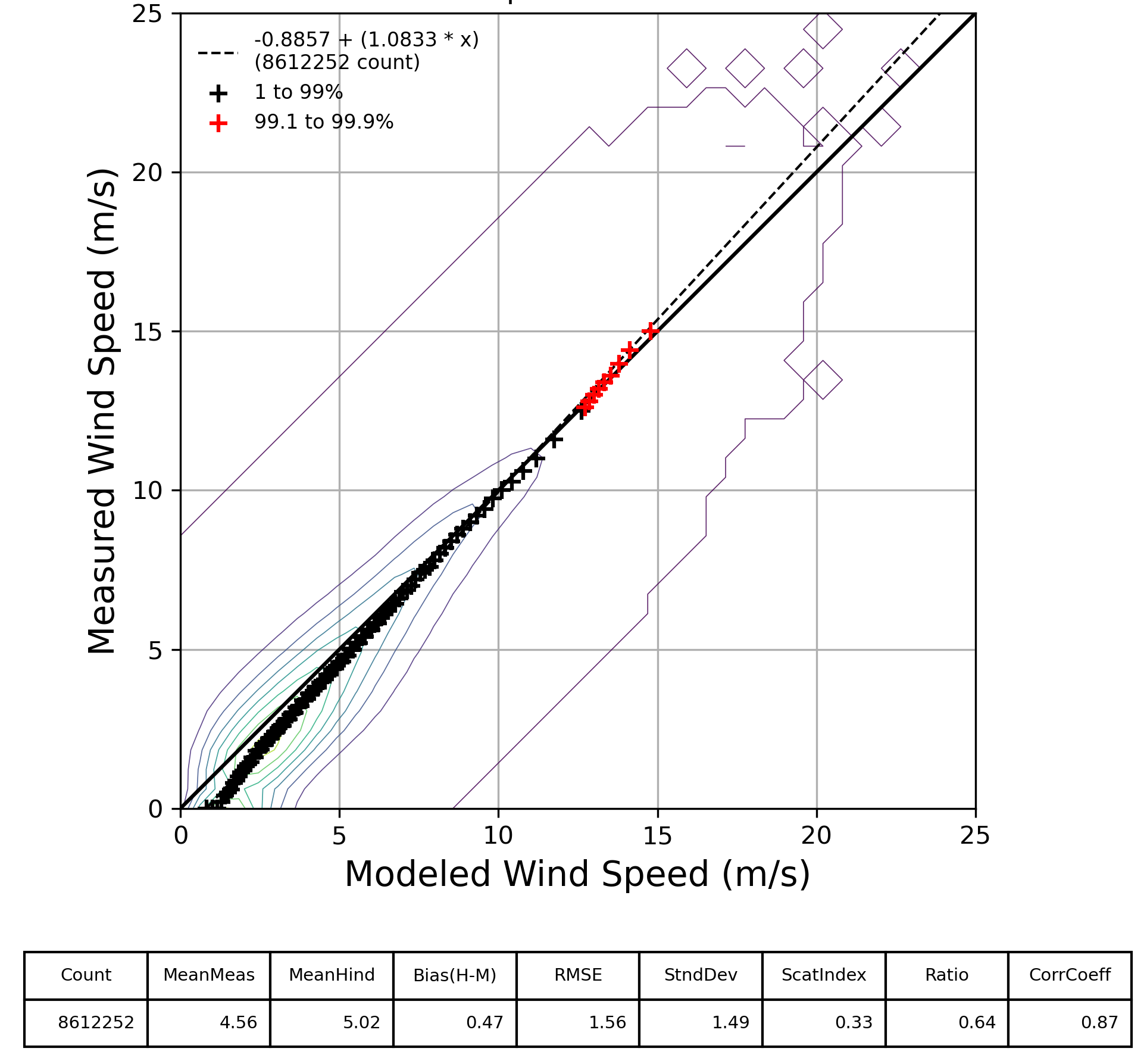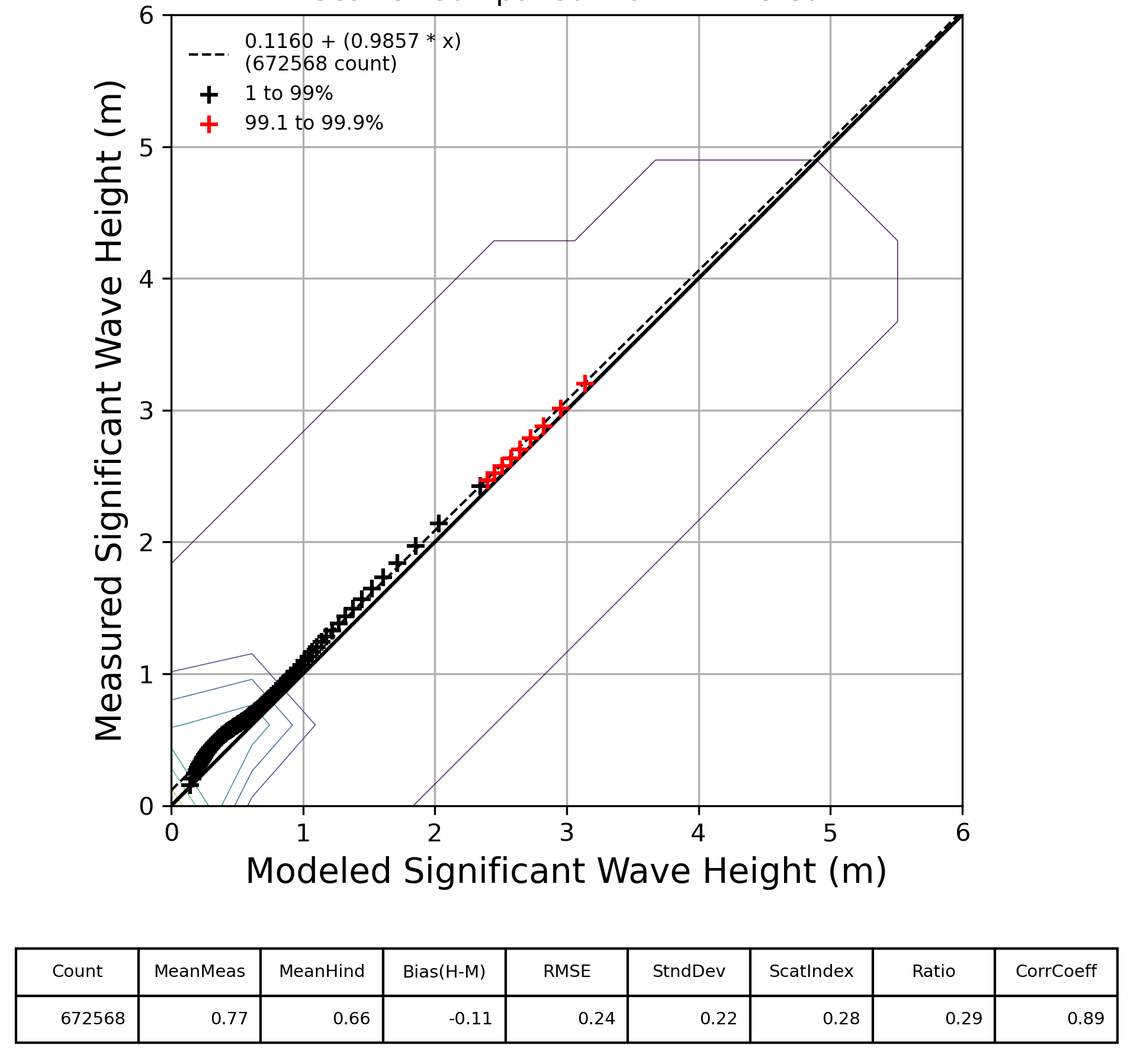 To quality control and validate the PERGOS-3 hindcast, modeled wind, wave and hydrodynamic parameters were compared to insitu and satellite measurements collocated in time and space. Despite relatively limited availability of remote-sensed measurements within the Gulf and uncontaminated by proximity to the coast, model comparisons of wind speed (WS) and significant wave height (HS) demonstrate low bias throughout including extreme upper 99.1-99.9%. Comparisons to private measurement programs in the Gulf show similar model performance.